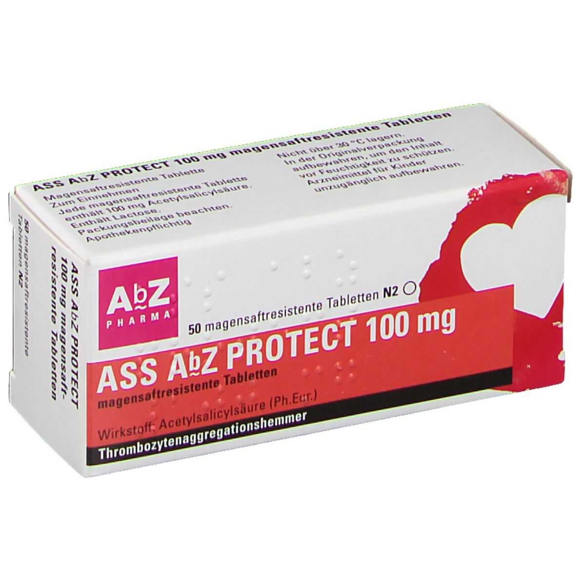 WebASS Protect 100 mg Tabletten (100 Stk.) Herzmittel Anwendungsgebiet Durchblutungsstörungen Wirkstoff Acetylsalicylsäure (ASS) Produktdetails. Achtung: Zu. WebEs wird eine Tagesdosis von 1 magensaftresistenten Tablette (entsprechend 100 mg Acetylsalicylsäure pro Tag) empfohlen. Der günstigste Zeitpunkt für den Beginn der. WebASS protect 100 soll lokal auf die Magenschleimhaut bekömmlicher wirken. Noch ein Tipp ASS 100 ist verträglicher mit Vitamin C zusammen eingenommen. Eine. WebProduktinformation zu ASS AbZ PROTECT 100 mg magensaftresistente Tabletten. Bei ASS AbZ PROTECT 100 mg handelt es sich um ein apothekenpflichtiges Arzneimittel der AbZ. WebASS AbZ PROTECT 100 mg soll bei Kindern und Jugendlichen mit fieberhaften Erkrankungen nur auf ärztliche Anweisung und nur dann angewendet werden, wenn. WebASS AL Protect 100 mg magensaftres. Tabletten 50 Stück: 00149972: 2,80: ASS ABZ Protect 100 mg magensaftresist.Tabl. 50 Stück: 01696788: 2,93: ASS ratiopharm 100 mg.