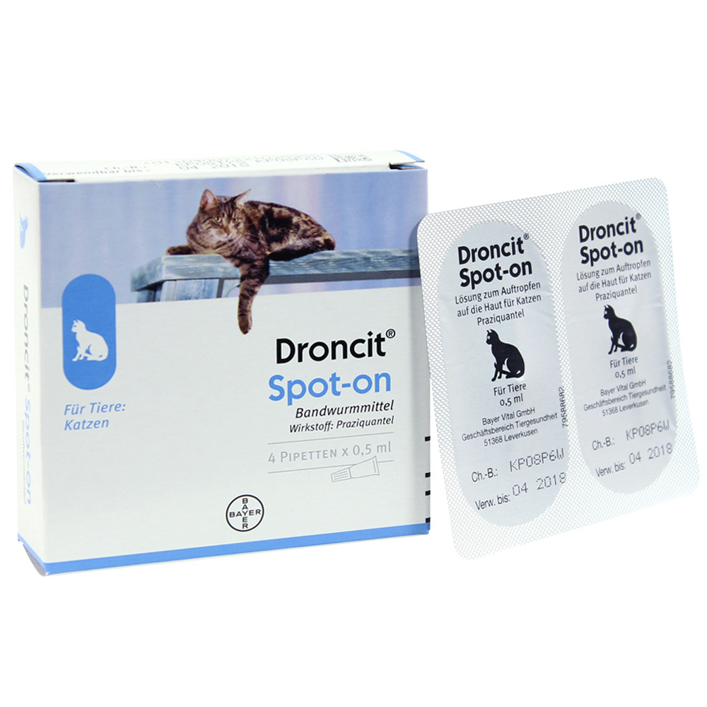 WebDRONCIT Spot on 40mg/ml ist eine Lösung zum Auftragen auf die Haut bei Bandwurmbefall bei Katzen. Die Faltschachtel enthält vier Pipetten mit jeweils 0, 5 ml. WebDroncit Spot-on 40 mg/ml Lsung zum Auftropfen auf die Haut für Katzen Praziquantel . 3. WIRKSTOFFE UND SONSTIGE BESTANDTEILE . 1 Pipette mit 0,5 ml klare, gelblich. WebDroncit 50 mg Tablette für Hunde und Katzen. Praziquantel. Qualitative und quantitative Zusammensetzung: 1 Tablette enthält: Wirkstoff(e): Praziquantel 50 mg.. WebDroncit Spot-on 40 mg/ml, Lösung zum Auftropfen auf die Haut für Katzen. Praziquantel. 2. Qualitative und quantitative Zusammensetzung: 1 Pipette mit. WebMit Droncit ist das kein Thema mehr. Sie lassen sich das Medikament gut in den Nacken träufeln und hatten nie irgendwelche Beschwerden danach. Ein sehr einfach zu.