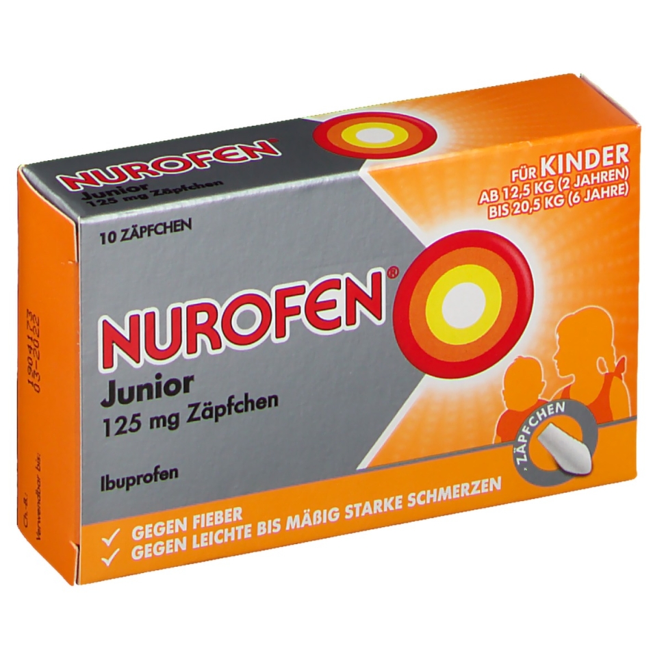 WebProduktbeschreibung. Die Nurofen Junior 125 mg Zäpfchen sind die ideale Alternative bei Fieber & Schmerzen, wenn die orale Verabreichung von Schmerzmitteln erschwert. .