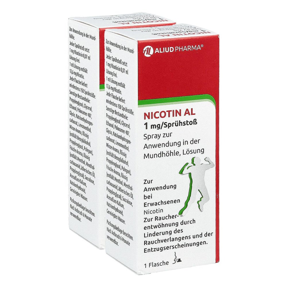 Nicotin Al 2 Stück Preisvergleich. WebNicotin AL 1mg/Sprühstoß Spray (2Stk.) Nikotinspray, Anwendungsgebiet Raucherentwöhnung, Wirkstoff Nicotin. ...mehr. 43 Angebote. ( 13,99 €/Stück) ab 27,98. .