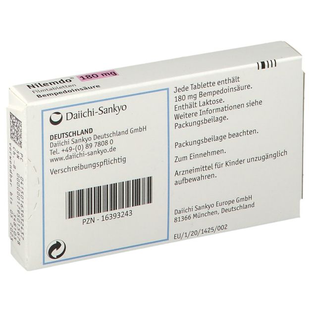 WebNilemdo enthält Lactose und Natrium Bitte nehmen Sie Nilemdo erst nach Rücksprache mit Ihrem Arzt ein, wenn Ihnen bekannt ist, dass Sie unter einer Zuckerunverträglichkeit. WebDie empfohlene Nilemdo-Dosis ist eine Filmtablette mit 180 mg einmal täglich. Gleichzeitige Therapie mit Simvastatin . Wenn Nilemdo gleichzeitig mit Simvastatin angewendet wird,. WebDieses Arzneimittel enthält weniger als 1 mmol Natrium (23 mg) pro 180 mg Filmtablette (Tagesdosis), d.h. es ist nahezu «natriumfrei». Informieren Sie Ihren Arzt oder Apotheker. WebBeipackzettel und wichtige Informationen zum Medikament NILEMDO 180 mg Filmtabletten: Wirkung, Anwendung, Gegenanzeigen, Nebenwirkungen, Dosierung,. WebNILEMDO 180MG FTA: Beschreibung: NILEMDO 180 mg Filmtabletten: Packungsgröße: 28 St: Darreichungsform: Filmtabletten: Hersteller: DAIICHI SANKYO DEUTSCHLAND. WebTablettenmaße: 13,97 mm × 6,60 mm × 4,80 mm. Nilemdo ist in Blisterpackungen aus Kunststoff/Aluminium in Kartons mit je 10, 14, 28, 30, 84, 90, 98 oder 100 Filmtabletten. WebDie Filmtabletten sind weiß bis weißgrau und oval, mit der Prägung „180“ auf einer Seite und „ESP“ auf der anderen Seite. Tablettenmaße: 13,97mm × 6,60mm × 4,80mm. Nilemdo.