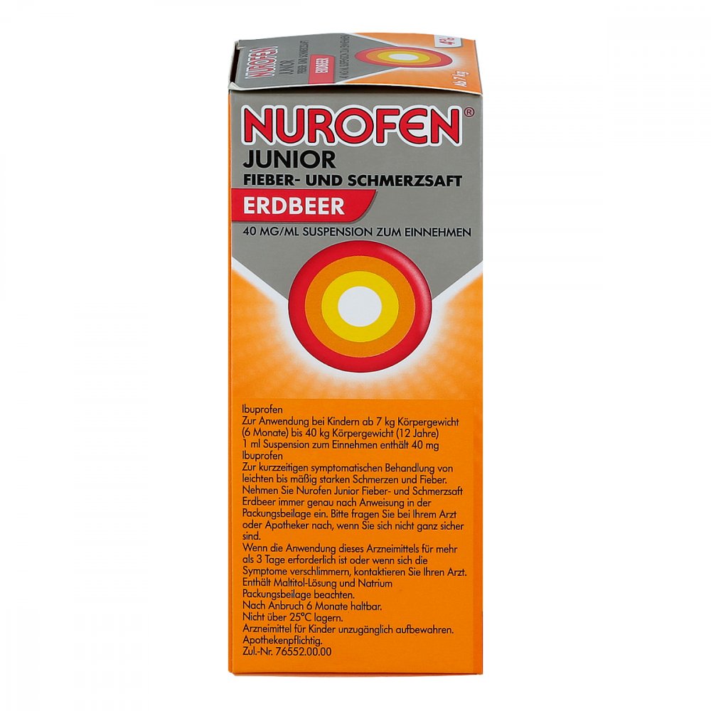 WebDas Präparat Nurofen Junior Fieber- und Schmerzsaft 40 mg ist besonders gut verträglich und daher schon für Kinder ab sechs Monaten bzw. einem Körpergewicht ab 7 kg. WebDie Dosierung richtet sich nach dem Körpergewicht: Ibuprofen ab 6 Monaten 4 bis 10 mg pro kg Körpergewicht als Einzeldosis und maximal 20 bis 30 mg. WebNUROFEN Junior Fieber- und Schmerzsaft Erdbeer 40mg/ml rezeptpflichtig & freiverkäuflich schnell und sicher Jetzt online kaufen in Ihrer Versandapotheke zurrose.de! NUROFEN. WebNurofen Junior Fieber- und Schmerzsaft Erdbeer 40mg. Fiebersaft Anwendungsgebiet Entzündungen Wirkstoff Ibuprofen Produktdetails. Achtung: Zu Risiken und. WebDer Nurofen Junior Fieber- & Schmerzsaft 40mg / ml ist eine flüssige Ibuprofen-Suspension zu Fieber- & Schmerzlinderung bei Kindern ab 6 Monaten und einem Gewicht ab 7 kg.. WebDer Nurofen Junior Fiebersaft 20mg / ml ist eine flüssige Ibuprofen-Suspension zur Fieber- & Schmerzlinderung bei Kindern ab 3 Monaten und einem Gewicht ab 5 kg. Schnelle. WebDer Nurofen Junior Fieber- & Schmerzsaft 40mg / ml ist eine flüssige Ibuprofen-Suspension zur Fieber- & Schmerzlinderung bei Kindern ab 3 Monaten und einem Gewicht ab 5 kg. -. WebDu kannst Nurofen ( oder andere Firma Wirkstoff ist Ibuprofen) und Paracetamol im Wechsel gehen. Wichtig ist das zwischen den gleichen Wirkstoff 8.