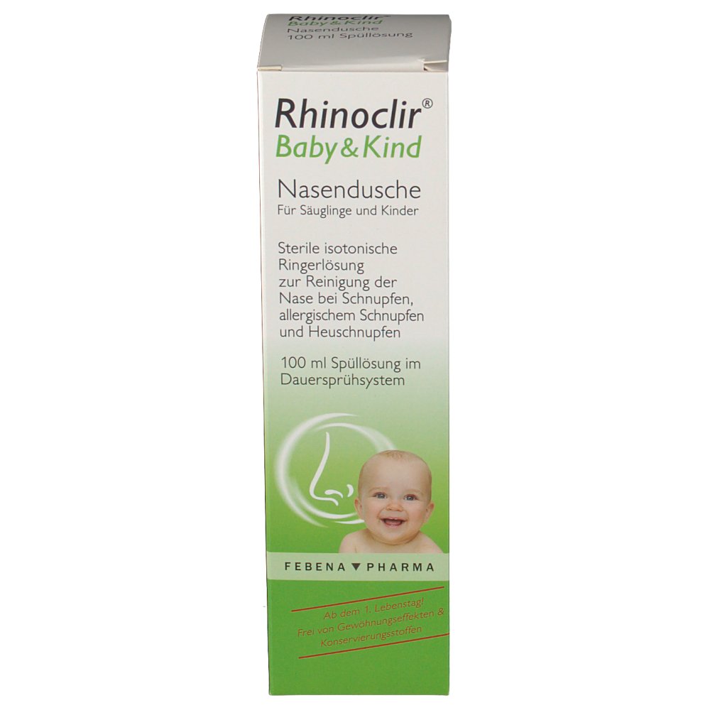 WebDie Rhinoclir® Baby und Kind Nasendusche ist in einer Packung mit 100 ml Fertiglösung im Dauersprühsystem zum Einsprühen in die Nase exklusiv in allen Apotheken erhältlich.. .