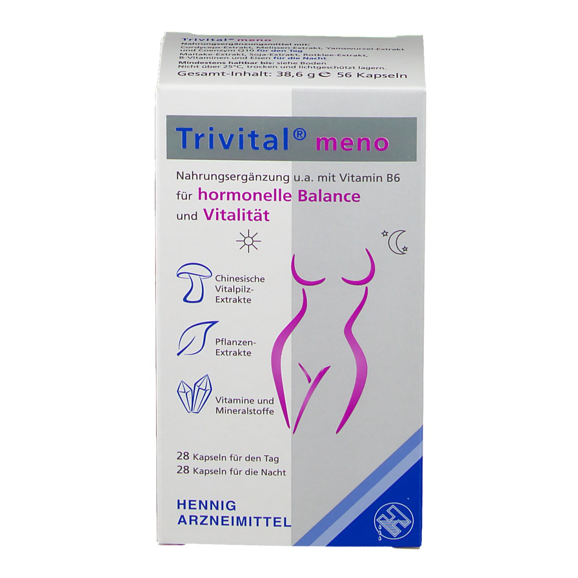WebZu Trivital® meno liegen leider keine näheren Informationen der Firma HENNIG ARZNEIMITTEL GmbH & Co KG vor. Präparate mit detaillierteren Informationen .. WebTrivital meno ist ein Qualitätsprodukt von HENNIG ARZNEIMITTEL. Mit mehr als 120 Jahren Erfahrung und eigenen Produktionsanlagen in Deutschland haben wir uns als. WebWas ist Trivital® meno? Trivital®menoist ein Nahrungsergänzungsmittel, das dank seines Tag-Nacht-Prinzips und der Kombination aus drei Arten von Inhaltsstoffen einzigartig ist.. WebTRIVITAL meno: Für hormonelle Balance und Vitalität, vegan, lactosefrei, glutenfrei, 56 Kapseln. 124. 34,05€ (460,14 €/kg) Mehr sparen mit dem Spar-Abo. Lieferung bis. WebAnwendung. Unterstützung in den Wechseljahren. Darreichungsform. Kapsel. Wirkstoffe. Cordyceps-Extrakt, Yamswurzel-Extrakt, Melissen-Extrakt,. WebDas Besondere an Trivital ® meno ist die Kombination pflanzlicher Inhaltsstoffe mit Vitalpilzen und ausgewählten Mikronährstoffen. So sind Rotklee, Soja oder Yamswurzel. WebBeim Produkt Trivital meno handelt es sich um ein sehr innovatives und wirkungsintensives Nährstoffkonzept, das sich die nachweislich positive Wirkung auf den Körper von. WebTrivital ® meno - u. a. mit Vitamin B6, das die Regulierung der Hormontätigkeit wie auch die normale psychische Funktion unterstützt. Trivital ® mental. WebTrivital® meno 56 Kaps. > mehr Details. Basisinformation Keine Basisinformation zu diesem Präparat verfügbar. Wirkstoff 1 Kapsel (Tag) ... und bietet. WebIch kann nur sagen, das Trivital wirkt bei mir super und meine sehr starken Hitzewallungen sind auf ein Minimum reduziert worden schon nach ein paar Tagen Einnahme. Leider ist.